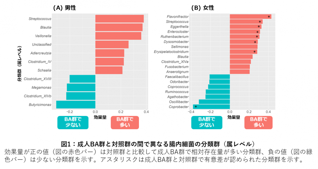 成人BA群と対照群で違いのある腸内細菌の種類(分類群)を調べた結果、成人BA群では呼吸器疾患に関連する分類群が多く、短鎖脂肪酸を産生する分類群が少ないという特徴がみられ、腸内細菌叢の構成に異常が起きていることが示唆されました(図1)。また、成人BAに関連する腸内細菌の分類群の多くは、男女で異なっており性差が存在していました。